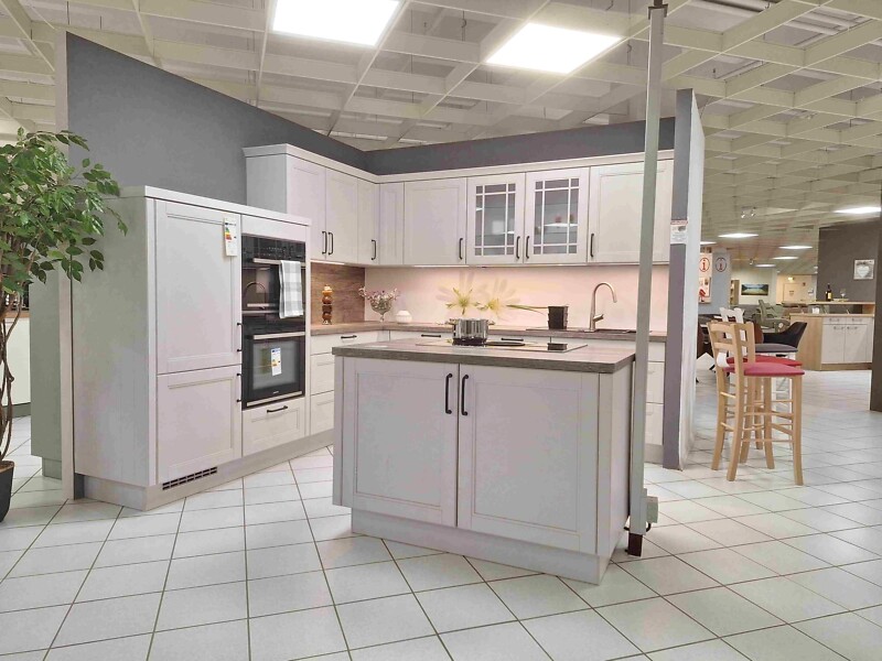 Elegante Musterküche York 25 in Weiß-Glanz mit Kochinsel!