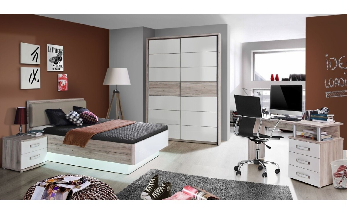 Modernes Jugendzimmer in Sandeiche Nachbildung mit Front Sandeiche Nachbildung kombiniert mit Weiß-Hochglanz. Die Schubkästen laufen auf Metall-Laufleisten, die Beschläge sind aus Metall und die Griffe aus Edelstahl.