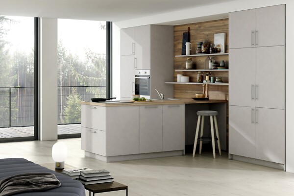 Sie erhalten diese Einbauküche wie abgebildet in Beton Kieselgrau Nachbildung (Fronten und Korpus). Die Ausführung der Arbeitsplatte ist veränderbar, hier bewusst ein Kontrast mit Alteiche Provence Nachbildung.