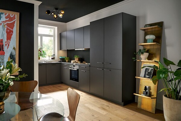 Sie erhalten diese Einbauküche wie abgebildet in Lavaschwarz (Fronten und Korpus). Die Ausführung der Arbeitsplatte ist veränderbar, hier in Lavaschwarz.