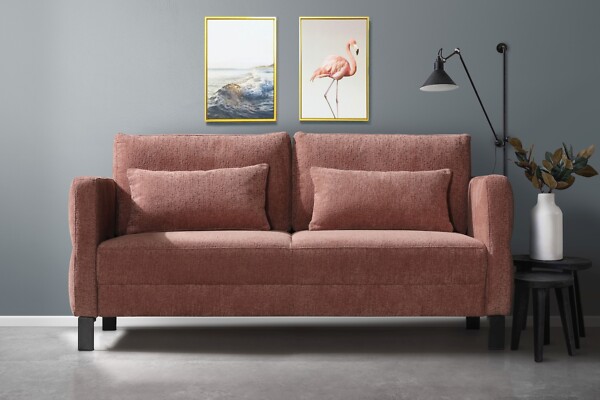 Das Schlafsofa LS23 Igris hier in dem Stoff 2-7042Gr.2 -6661 Lachs mit passenden Kissen in 100 % Polyester (Pflegeleicht!) Chenilleflachgewebe, inklusive der gezeigten Bettfunktion (Trio-Falt-Funktion), Kissen und Metalfüßen in Schwarz. Bis zu 120 kg belastbar.
