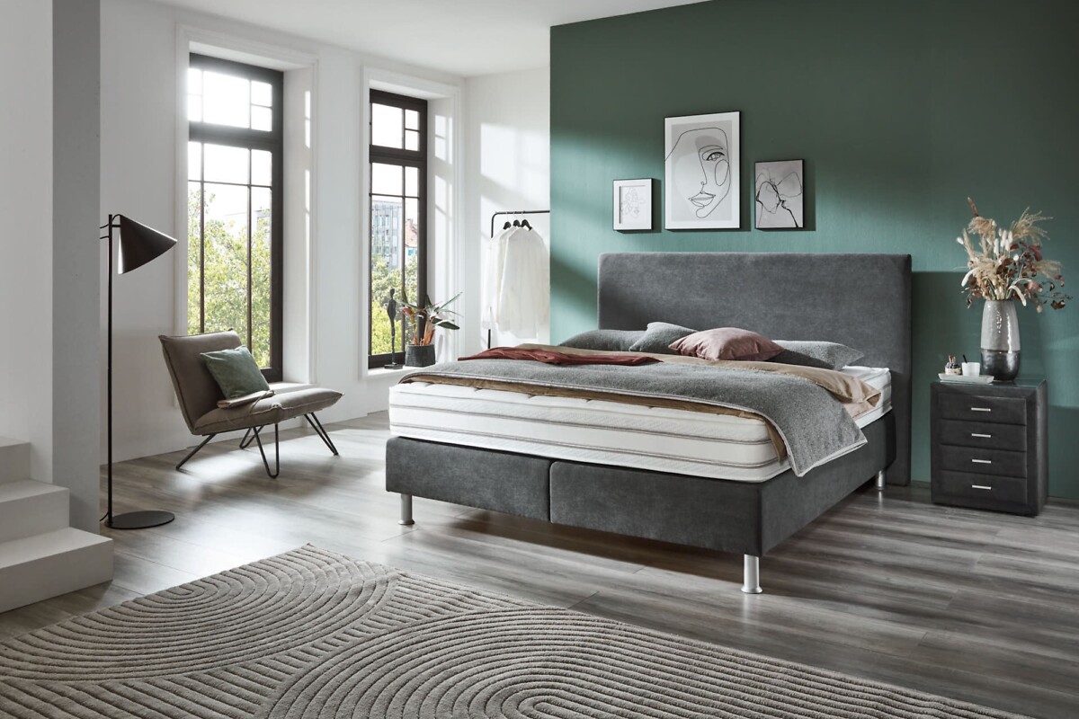 Das Boxsringbett Alunzio hier abgebildet in Stoff Enjoy Anthrazit, PG2. Es hat einen Unterbau in Bondellfederkern. Die Füße erhältlich in ca. 10 cm oder 15 cm alufarben Kunststoff. Der Rücken vom Kopfteil ist unecht. Die Matrazen erhalten Sie in Taschenfederkern H2 oder H3.