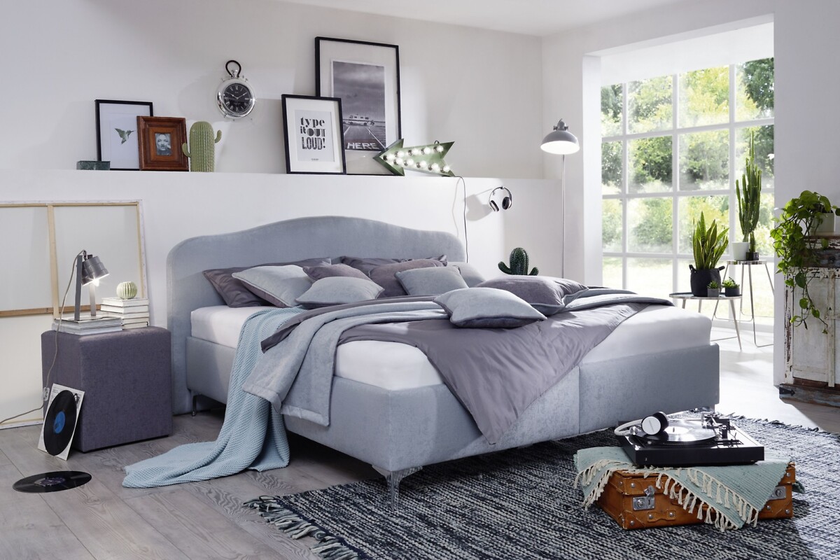 Das Polsterbett Vesle hier abgebildet in Stoff Gruppe A in Graublau aus 100% Polyester. Es hat einen Bettkasen mit Bettkatenbelüftung und einen 28iger Federholzrahmen. das Polsterbett Kesle steht auf 4 silberfarbenen Metalfüßen. Inklusive 2 Taschenfederkernmatratzen in H2.