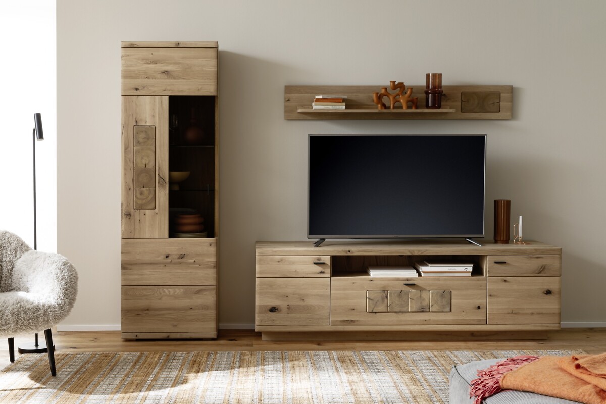 Sie erhalten die Wohnwand, bestehend aus: Vitirne, Wandboard und TV-Element in Balkeneiche massiv geölt. Der Korpus ist keilverzinkt. Die Hirnholzapplikation sind in Kristlleiche geölt.