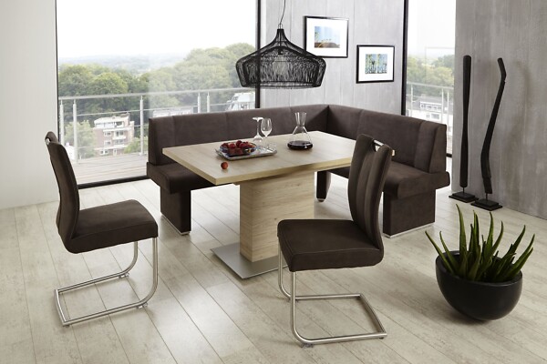 Diese elegante Polstereckbank erhalten Sie mit dem Bezug in Microfaser Dunkelbraun (100 % Poyester) mit Sitz- und Rückenpolster. Inkl. Kontrastnaht
